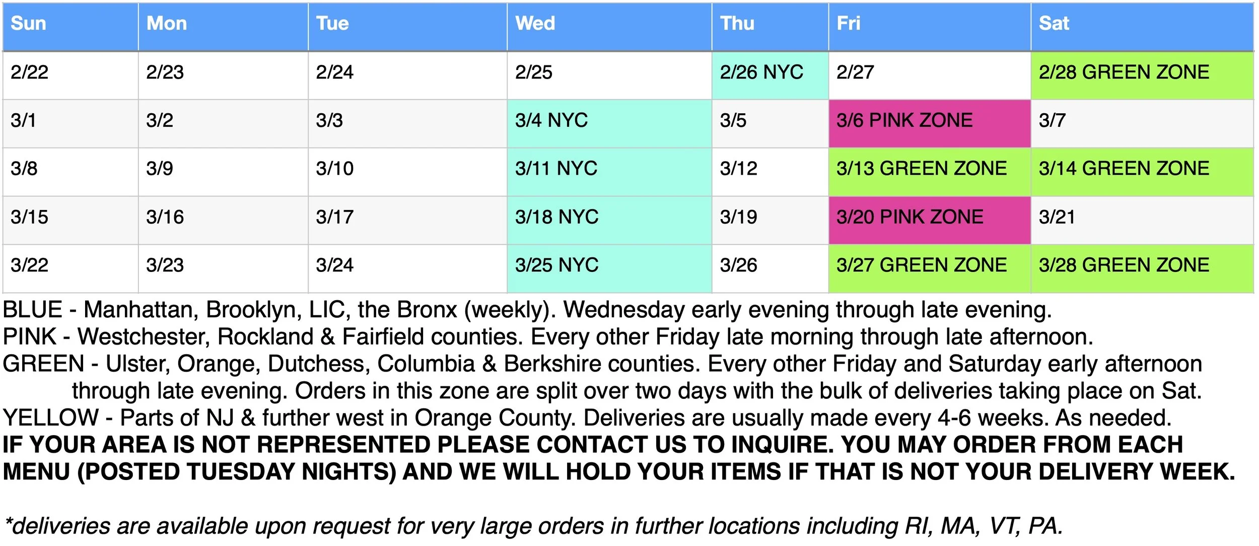 A new menu is posted every Wednesday or Thursday evening. Please order early for the best selection.